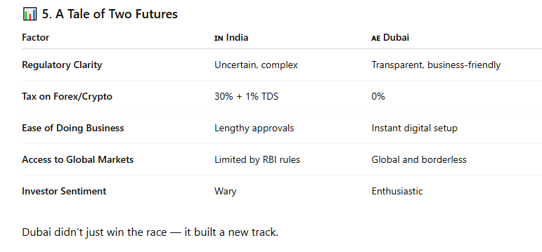 Meanwhile, Dubai moved decisively — offering clear rules, tax freedom, and open arms to innovators. The result: a quiet migration of India’s best fintech minds and forex professionals to Dubai.
